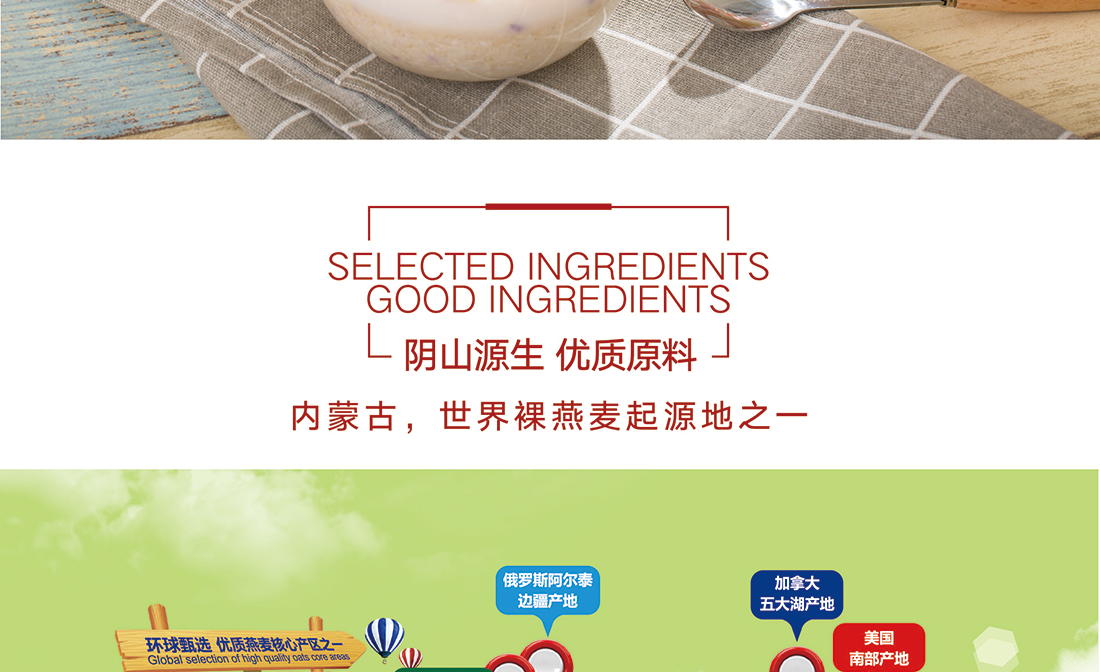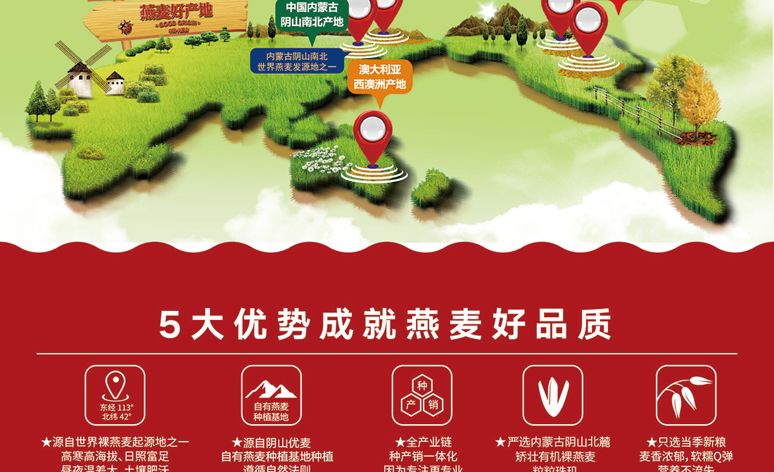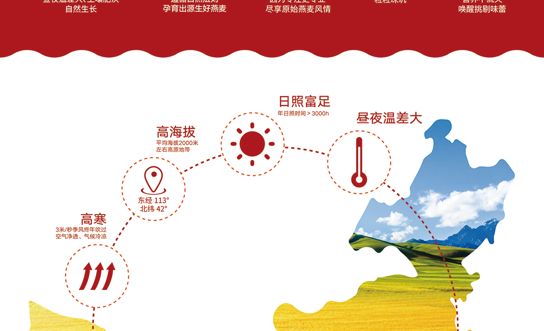 內蒙古,世界裸燕麥起源地之一;陰山源生燕麥在此初生滿足生長規(guī)律一切所需,高寒、高海拔、日照充足;遵循自然法則,靠天滋養(yǎng),自然生長;