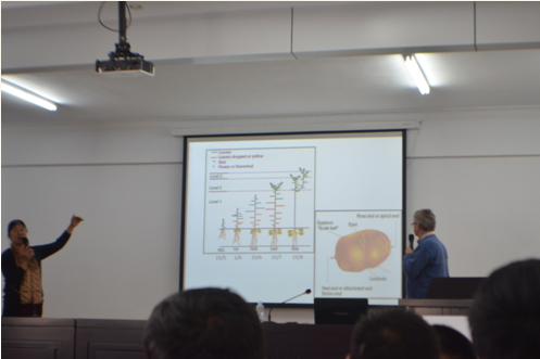 培訓(xùn)會上,Harrie先生對馬鈴薯規(guī)范化種植管理的重要意義進(jìn)行了深刻闡述,并就馬鈴薯各生長周期內(nèi)易發(fā)、頻發(fā)的病蟲害及其防治措施與馬鈴薯種植、生產(chǎn)全程現(xiàn)代化管理等內(nèi)容進(jìn)行了講解,理論聯(lián)系實際,內(nèi)容詳實全面,得到了參訓(xùn)學(xué)員的廣泛認(rèn)可。培訓(xùn)全程為英語授課,為了使參訓(xùn)學(xué)員能夠真正聽得懂、學(xué)得會,公司特聘內(nèi)蒙古農(nóng)業(yè)大學(xué)農(nóng)學(xué)專業(yè)教授進(jìn)行了全程翻譯。